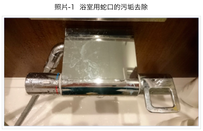 The thickness of this coating film is only 10–20 nm, making it invisible to the naked eye. As a result, it does not alter the appearance of the material while still providing anti-fouling performance. Photo 1 shows a bathroom faucet where the coating agent was applied to the right half. After one month of use, the dirt was wiped off with a cloth. Normally, water scale and detergent residue that cannot be removed simply by wiping can be easily removed from surfaces coated with this material.